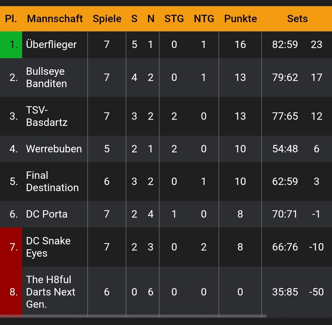 Die Tabelle täuscht, zwar stehen wir immer noch auf dem zweiten Platz, aber wenn die anderen ihre Nachholspiele durchbringen, könnte es mit dem Saisonziel Platz 4 noch schief gehen. Weiter geht es am kommenden Samstag erneut in Steinbergen um 19 Uhr mit dem Derby gegen „Final Destination“.
