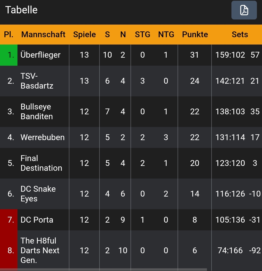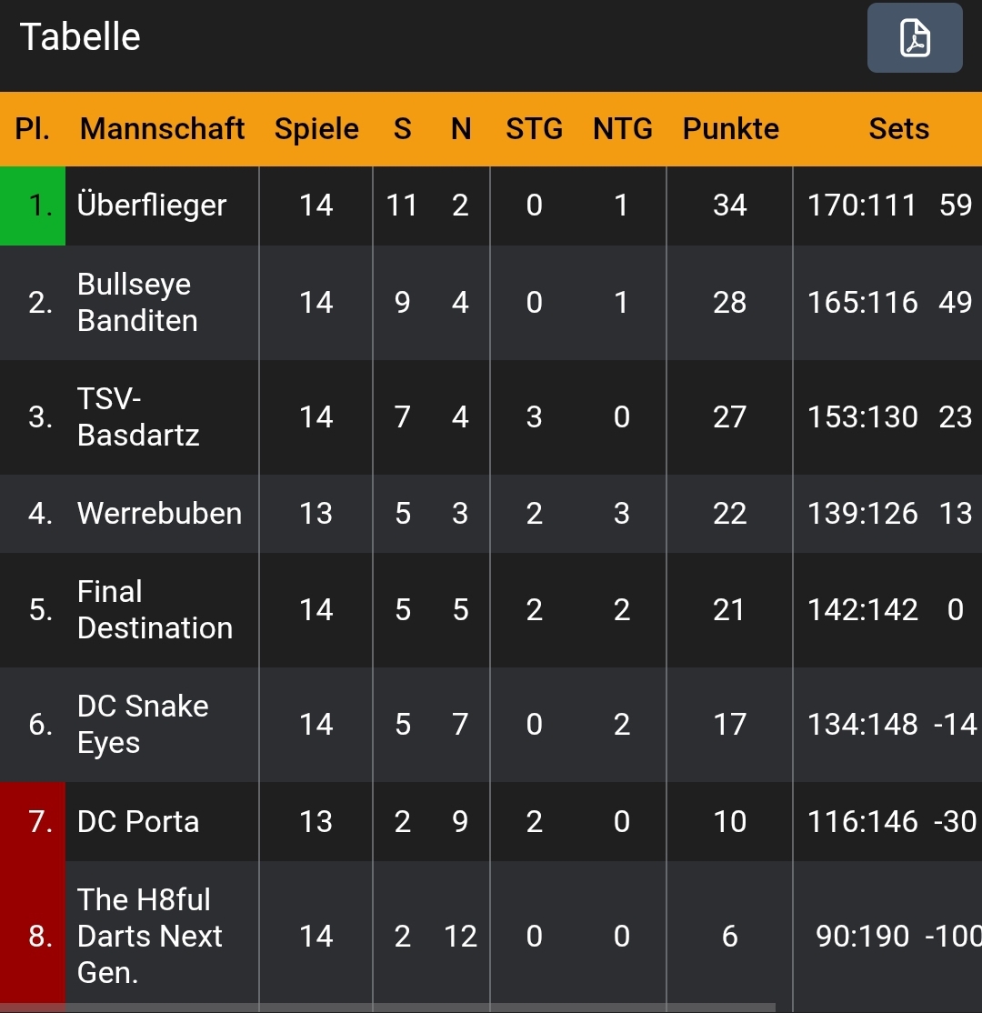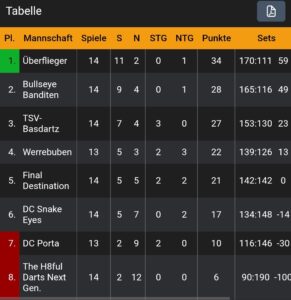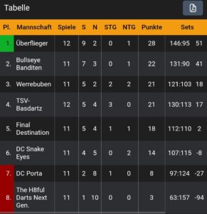 Nun geht es erst weiter am 03.01. in Steinbergen um 19.30 Uhr mit dem schwersten Spiel der Rückrunde, gegen die „ Bullseye Banditen“, da wird sich so langsam entscheiden, welcher Tabellenplatz es am Ende werden könnte. Grundsätzlich sind wir unserem Ziel von mindestens Platz 4 schon sehr nah.
