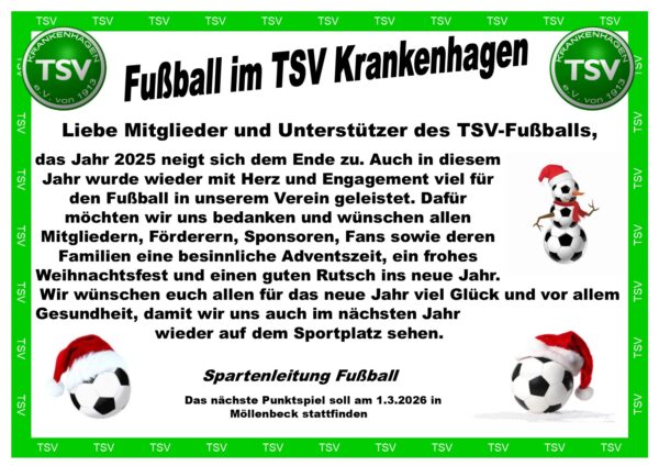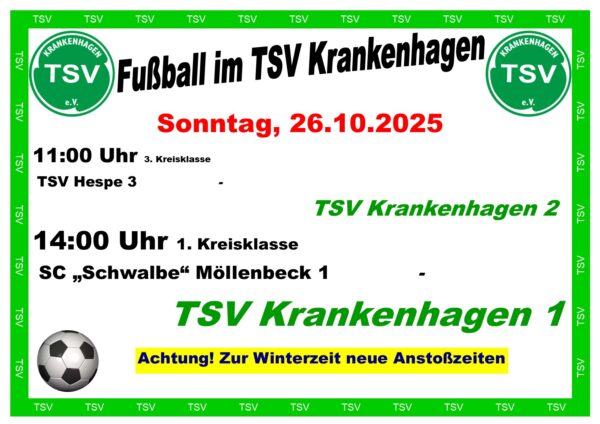 Der TSV Krankenhagen weist für die Saison 2025/26 drei Herrenmannschaften auf und kann somit in Kooperation mit der Jugendabteilung für interessierte Fußballer jeden Alters und Ambitionen eine Mannschaft präsentieren.